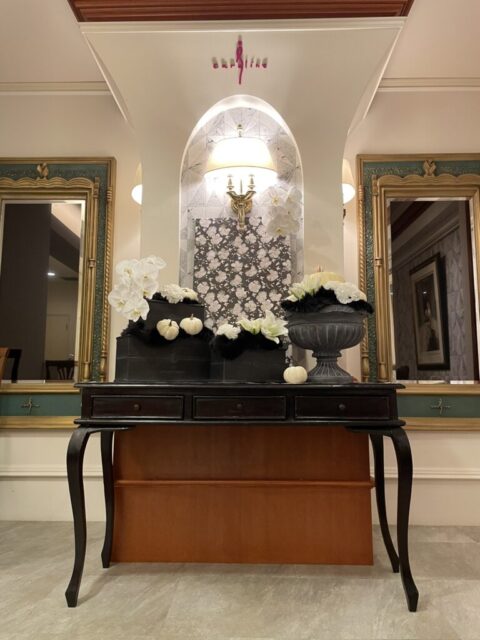エレベーター前やフロントの小窓のディスプレイ、ドレッサーやお化粧室までハロウィン一色🎃